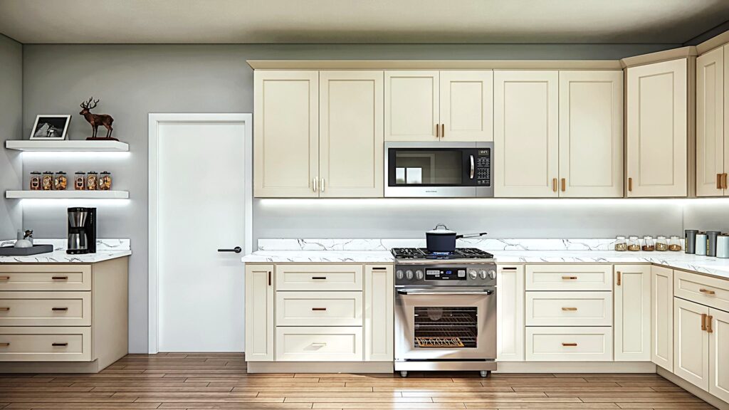 White Shaker, Norris Grey, Fresh Sage Green, and Natural Hickory are all available in store, and full kitchen sets can be taken home with you the same day.