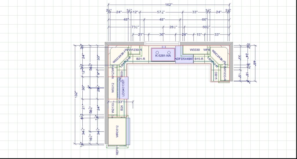- Measure your appliances – refrigerator (height, width, and depth), range (width), microwave (height and width), dishwasher (height)
