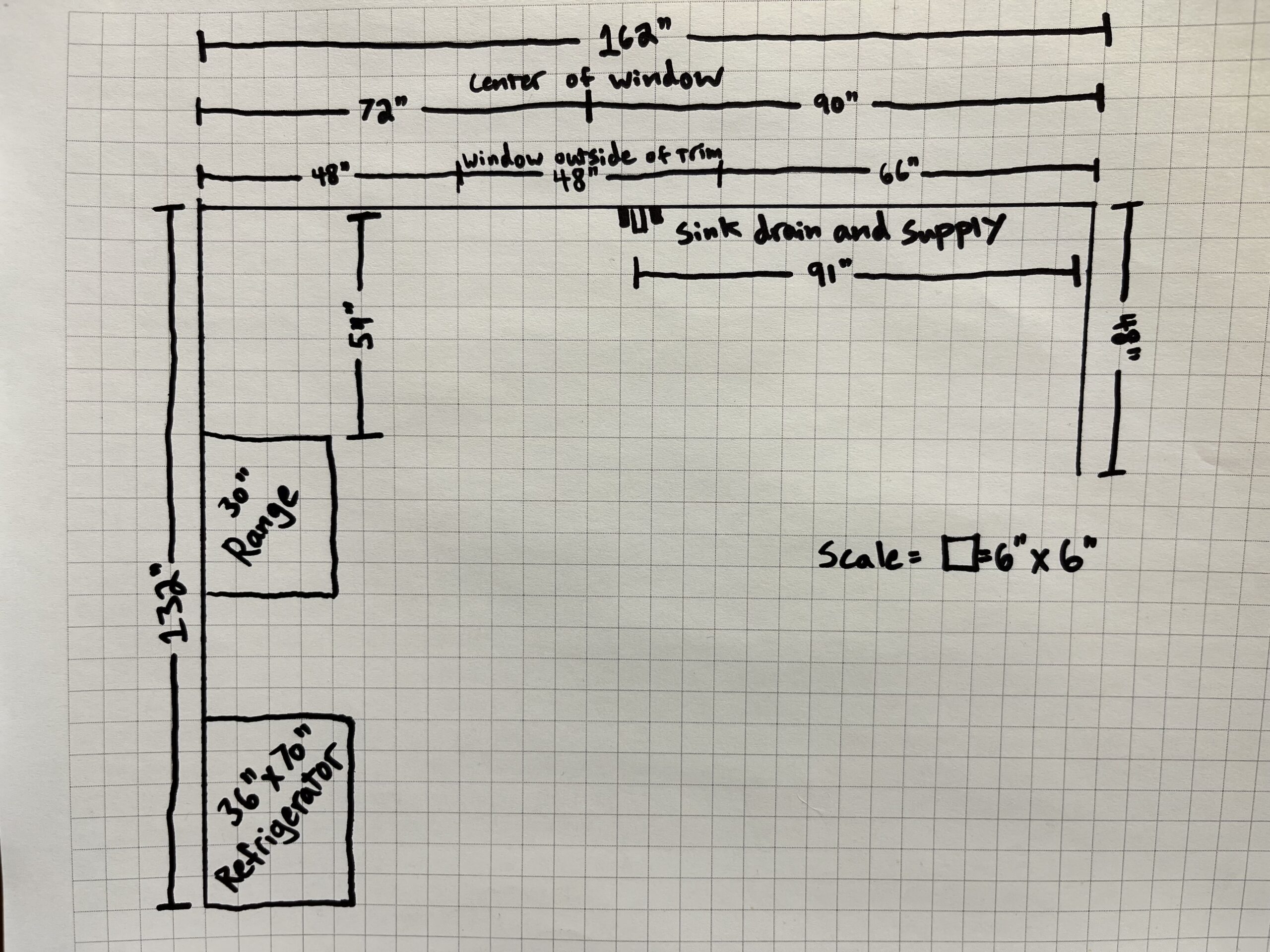 - Measure your items – wall corners to outside of window trim, windows from outside trim to outside trim right to left and up to down, wall corner to the center of the window, wall corner to the sink drain and supply line cluster, wall corner to the start of your range